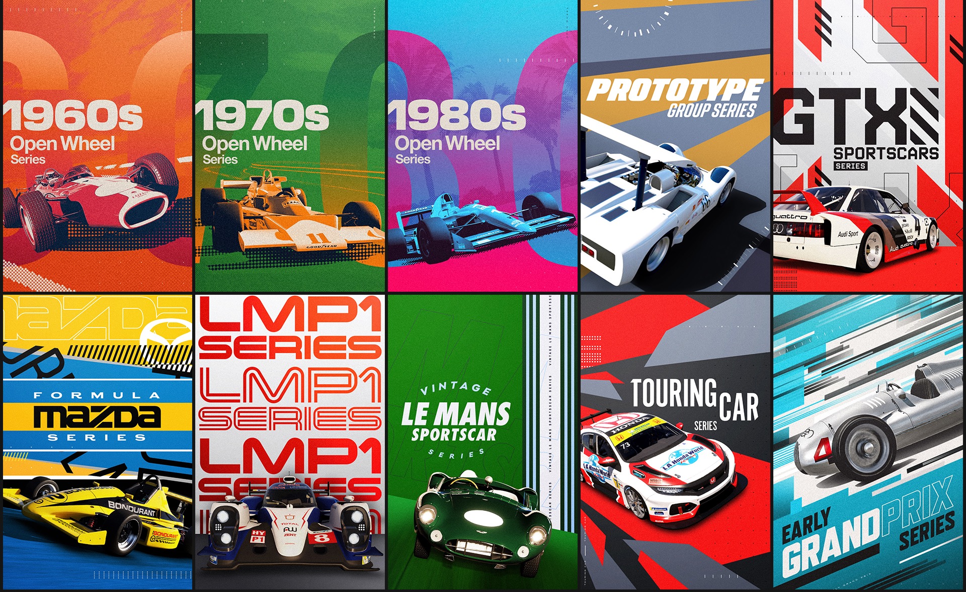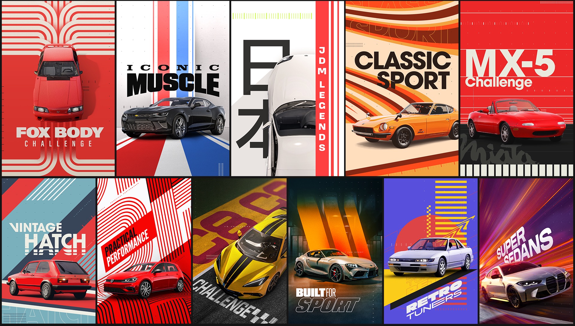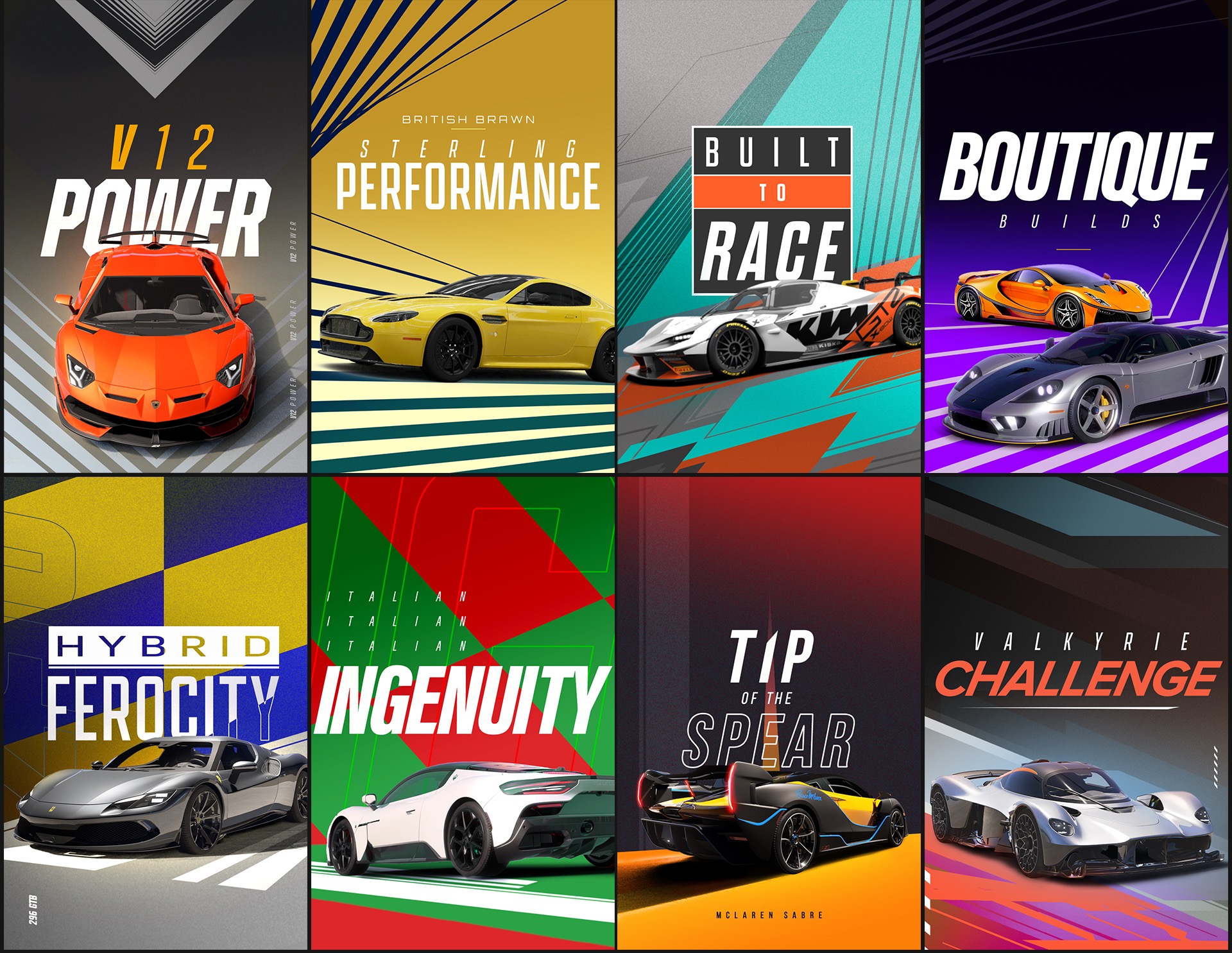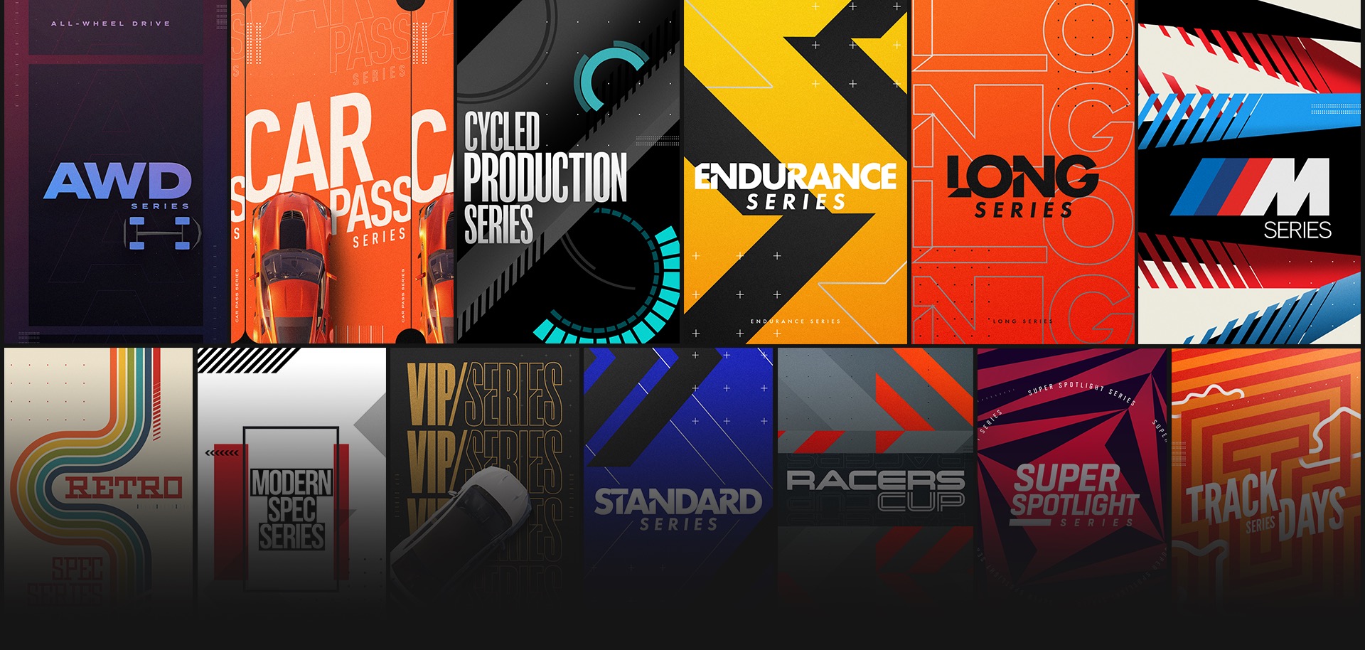 We first set out to come up with a graphic language that would allow for a wide variety of design styling but hold true to the Forza sensibilities and aesthetics. This approach was used to inform how our collection of graphic posters would adapt and flex for each individual event, group, tour, and race.