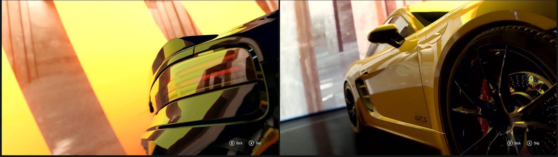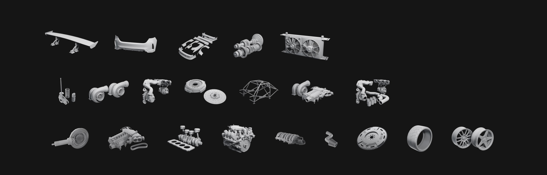 These vignettes are focused on each section a player can explore. The cars, engines, and parts are straight from the game and modified into the black and gold style. This global design language becomes a high-level staple of the game’s visual look and feel out the menu experience.