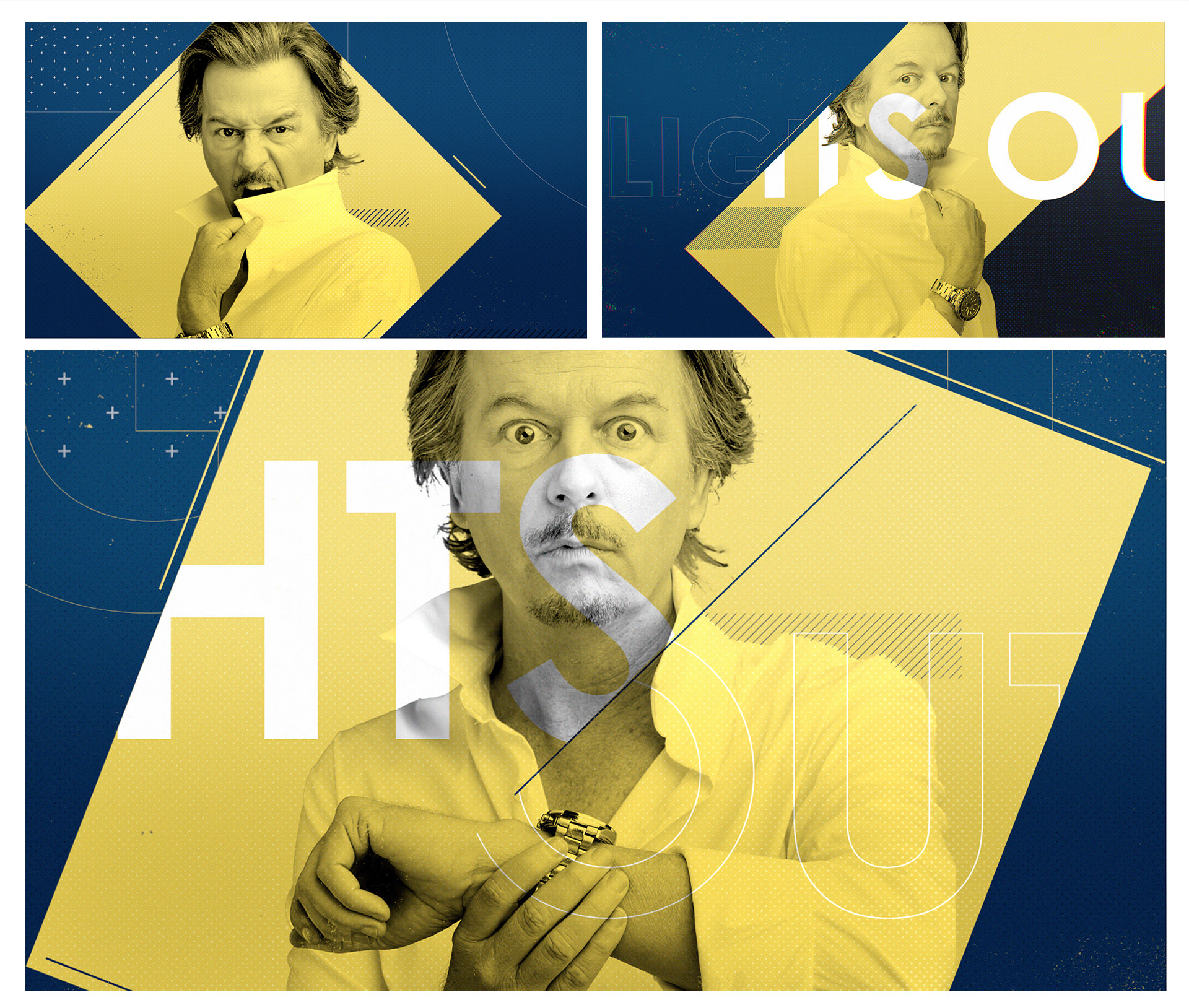 Network toolkits are all about the process and collaboration from start to finish. It’s an aspect that always pulls the best out of an otherwise amorphous project. To really find the best interplay of design and photography or motion and timing, you’ve really got to know your subject and your audience. In this case, we wanted to highlight marketing photography and push and angle of irreverence fused with confidence and sharp opinion. After all, Lights Out is all about current events and commentary with some of Spade’s closest friends. This package needs to embody the camaraderie and sophistication that comes with these high-profile guests.