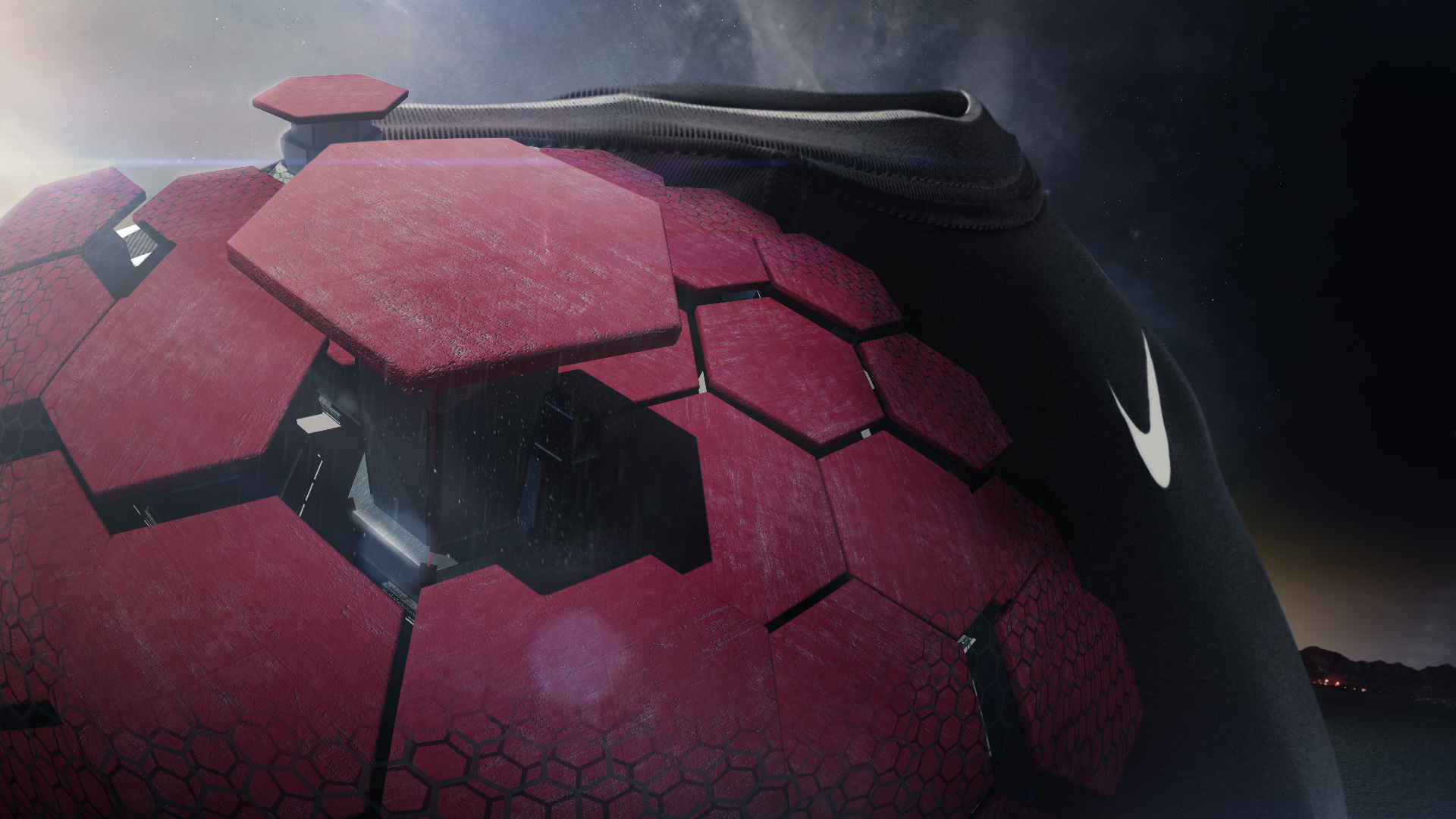 Since both of these products were hyperbolic in their own right, we wanted to extend the spirited metaphors into their own larger-than-life extrapolations. Cleats become drills, padding becomes a good set of landing gear and the ventilation perforation on the shirt turn into massive wind turbines. These technology vignettes were done in a way to capture the idea of the technology and make it more relatable in an impactful way. Hell yes I want drills on my shoes!