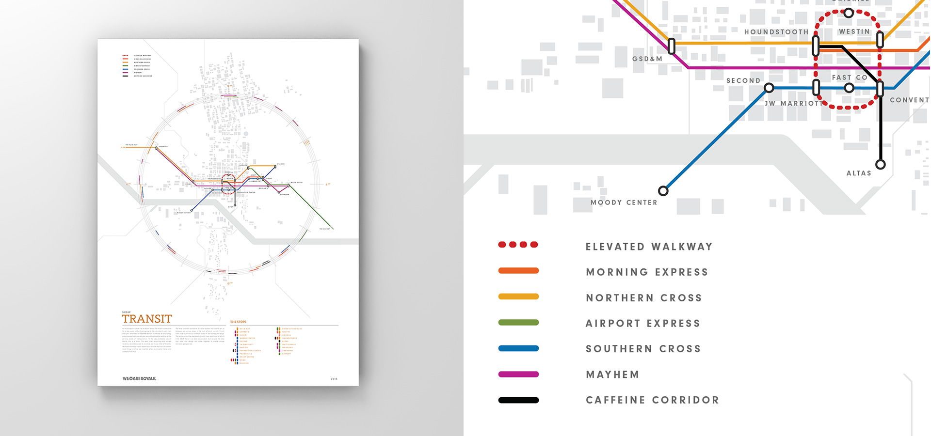 A raised walkway connecting all of the major hotels and convention center downtown creates a central arterial. A dedicated airport line connects to the house and a highly specialized “Mayhem Line” narrates an infamous all-night crawl. The outer rings visualize when various lines were actually used and how long the trips took. All said and done, the SXSW Transit map is a narrative visualization of one infamous year to the city in the middle of Texas. If you study it close enough, that story starts to emerge.