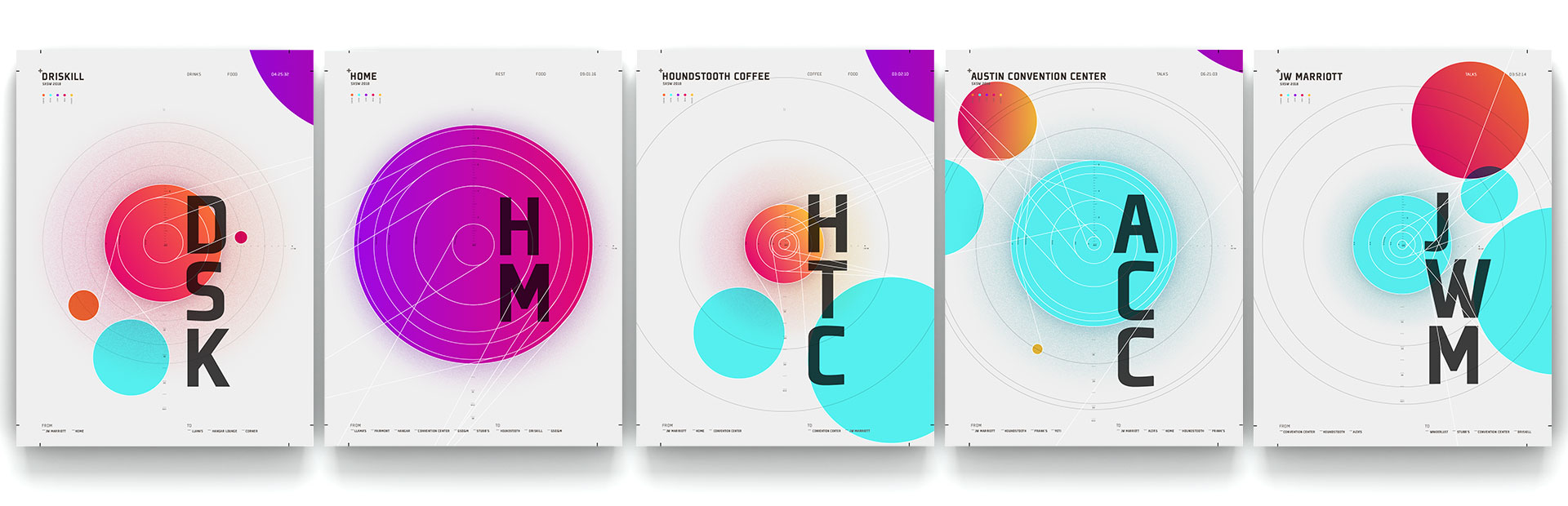 In a recent addition to this collection, I envisioned “top locations” as planets in their own solar system complete with orbits, moons, and space dust. The SXSW Planets visualize locations that had been visited more than once in our most recent trip. Many spots around Austin were single visit spots but these 5 rose above the rest as we would return to them over and over again. The house, coffee shop, convention, and key client meet-ups reveal a part of SXSW that is more closely representative of our actual trip.