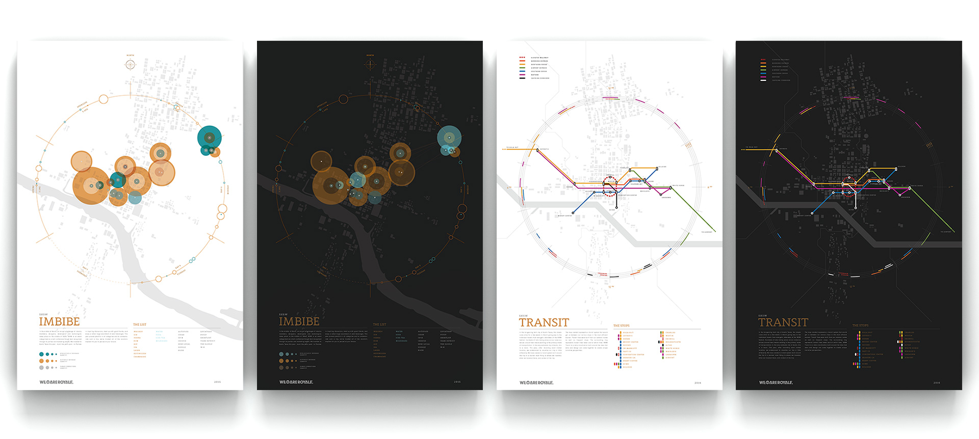 The takeaway from the SXSW Imbibe poster is a data visualization of a unique group of people enjoying a rather booz-heavy trip to the interactive conference. As you start to look closer at the print a few interesting stories begin to emerge. In the upper-right, more water was consumed than alcohol. Another hot-spot of non-alcoholic action explodes in the center of town where a morning coffee was our elixir of life.